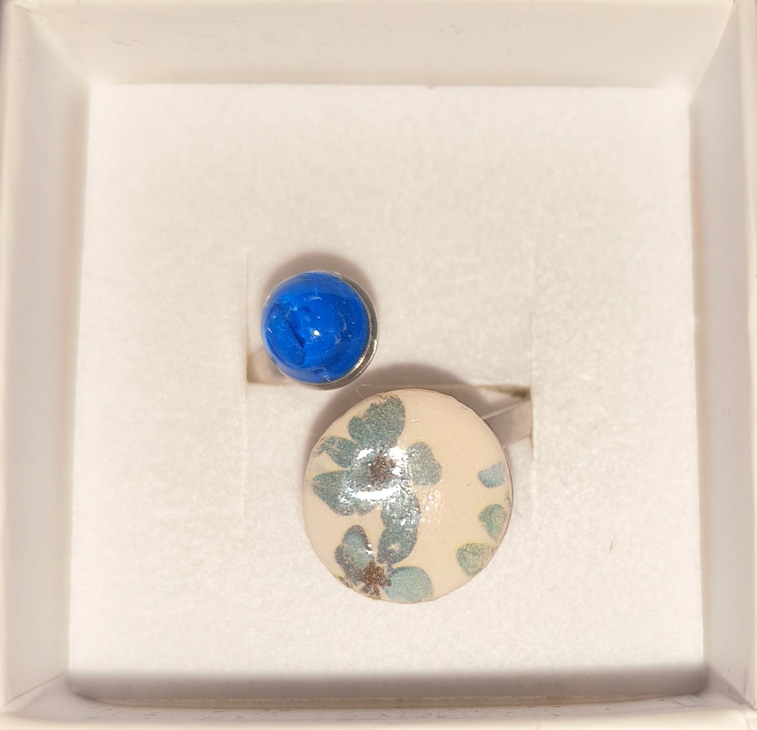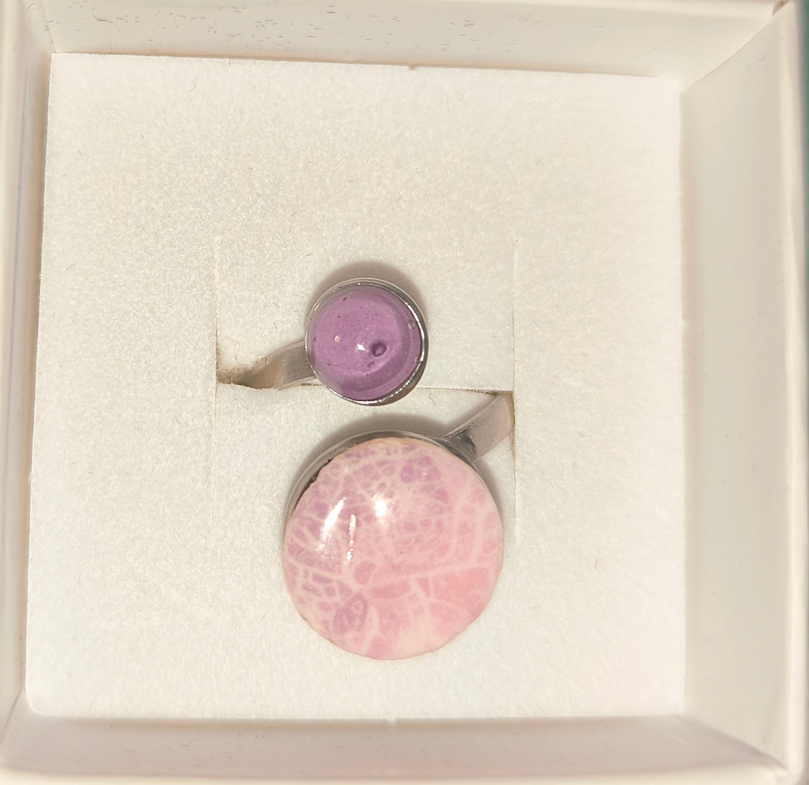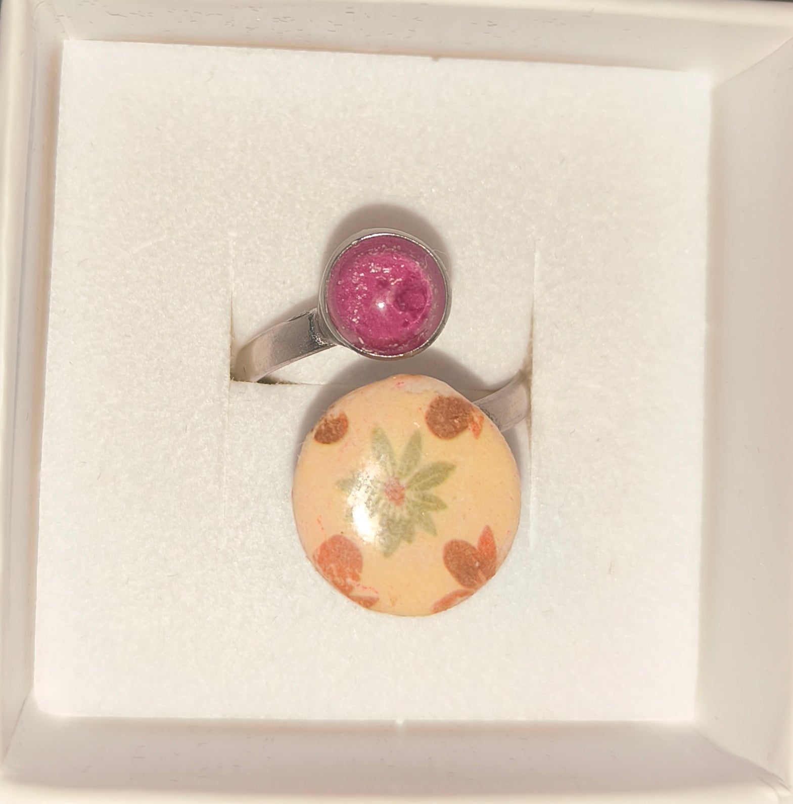 Preciosos anillos de arcilla polimérica inspirados en la colección años 50. Se componen de un circulo de papel pintado vintage que gira y una burbuja de color