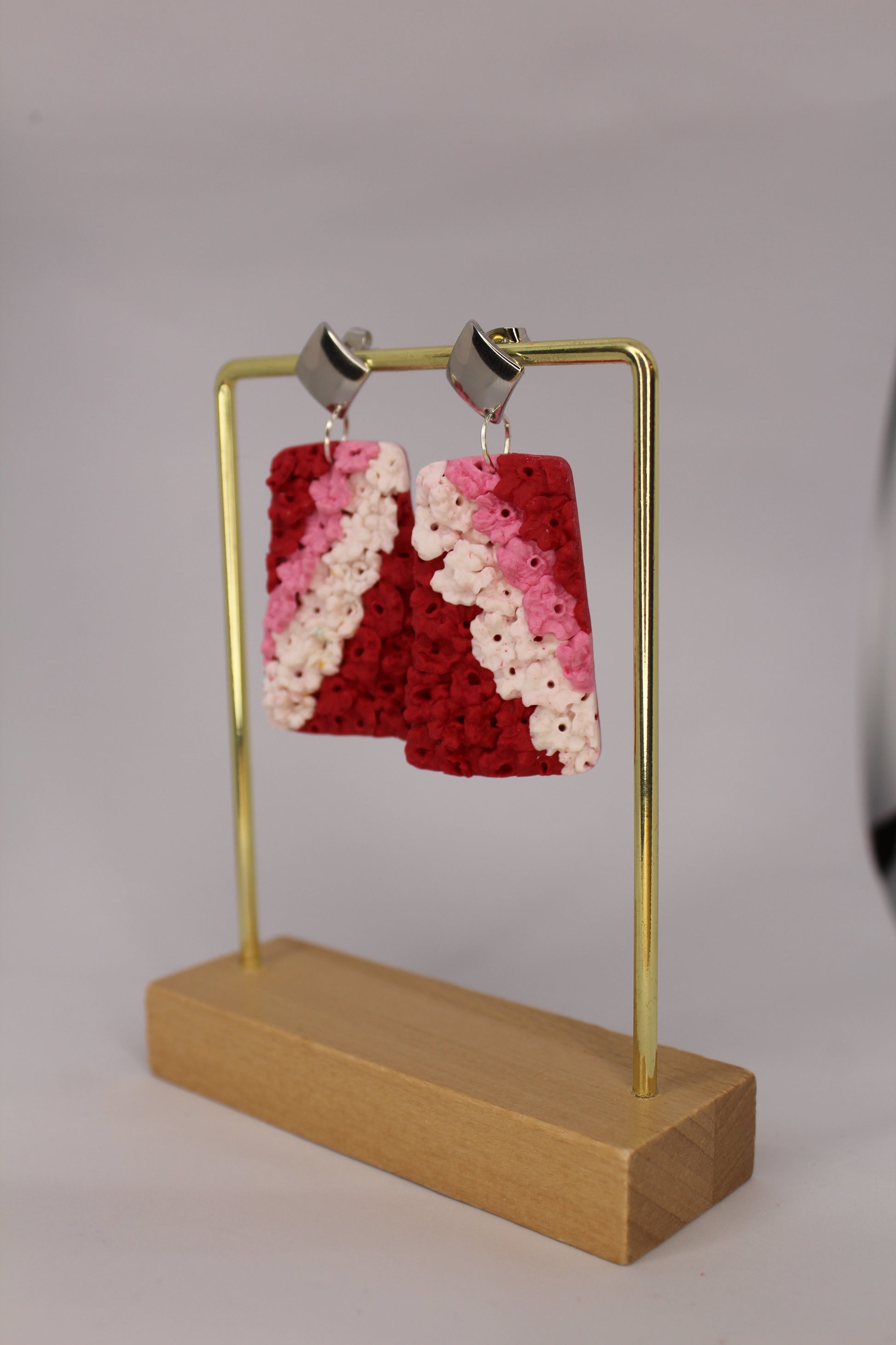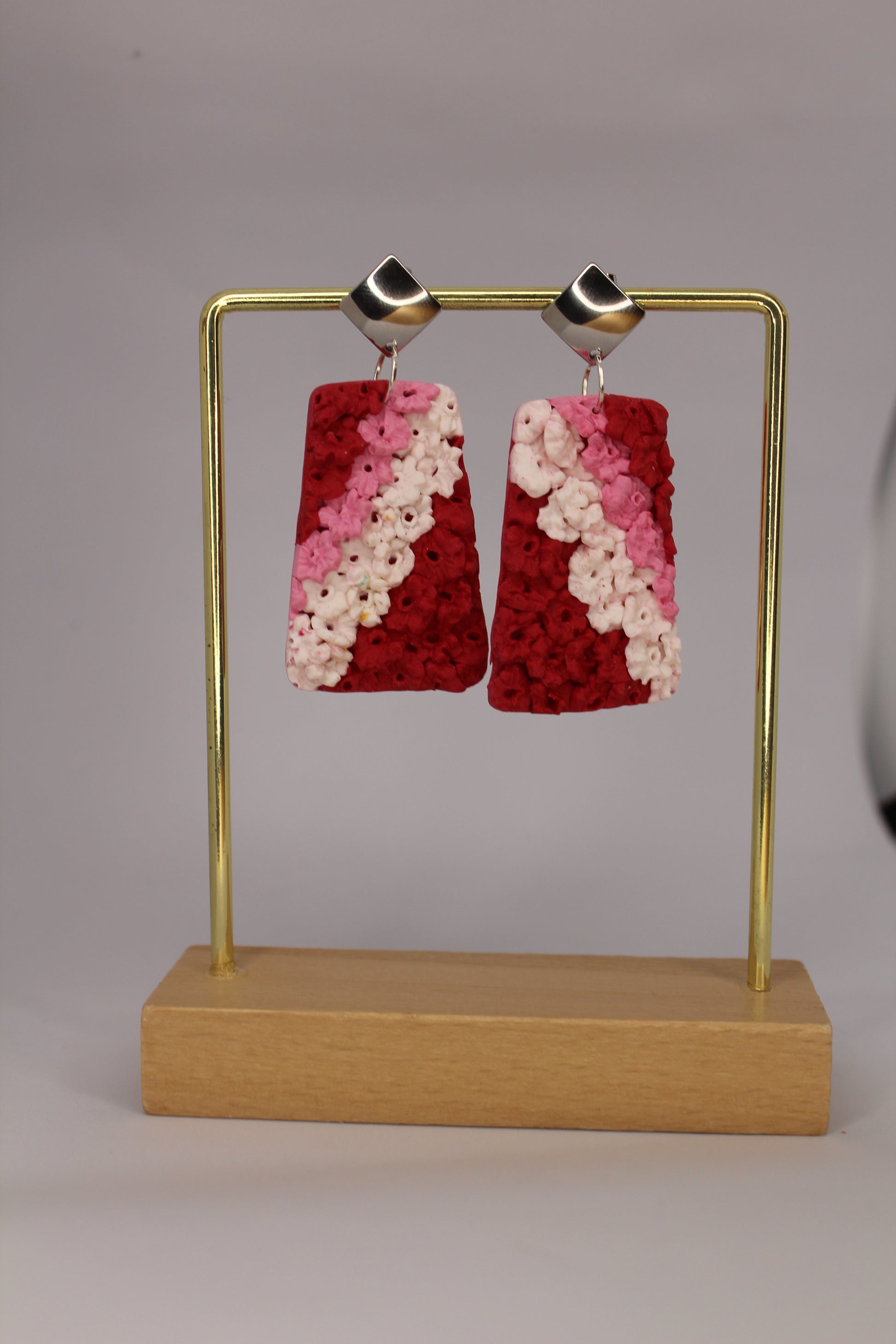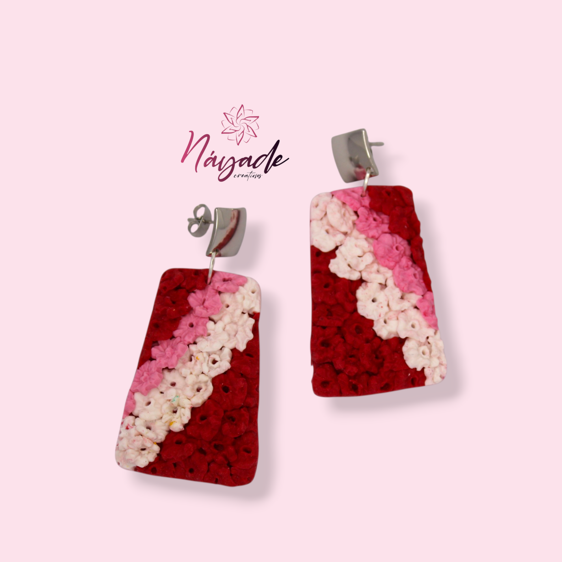 Se entregan ramos de claveles que los artistas convierten en un manto de flores para engalanar la virgen. Estos pendientes simulan ese manto con los colores típicos de la ofrenda (Rosa, rojo y blanco)