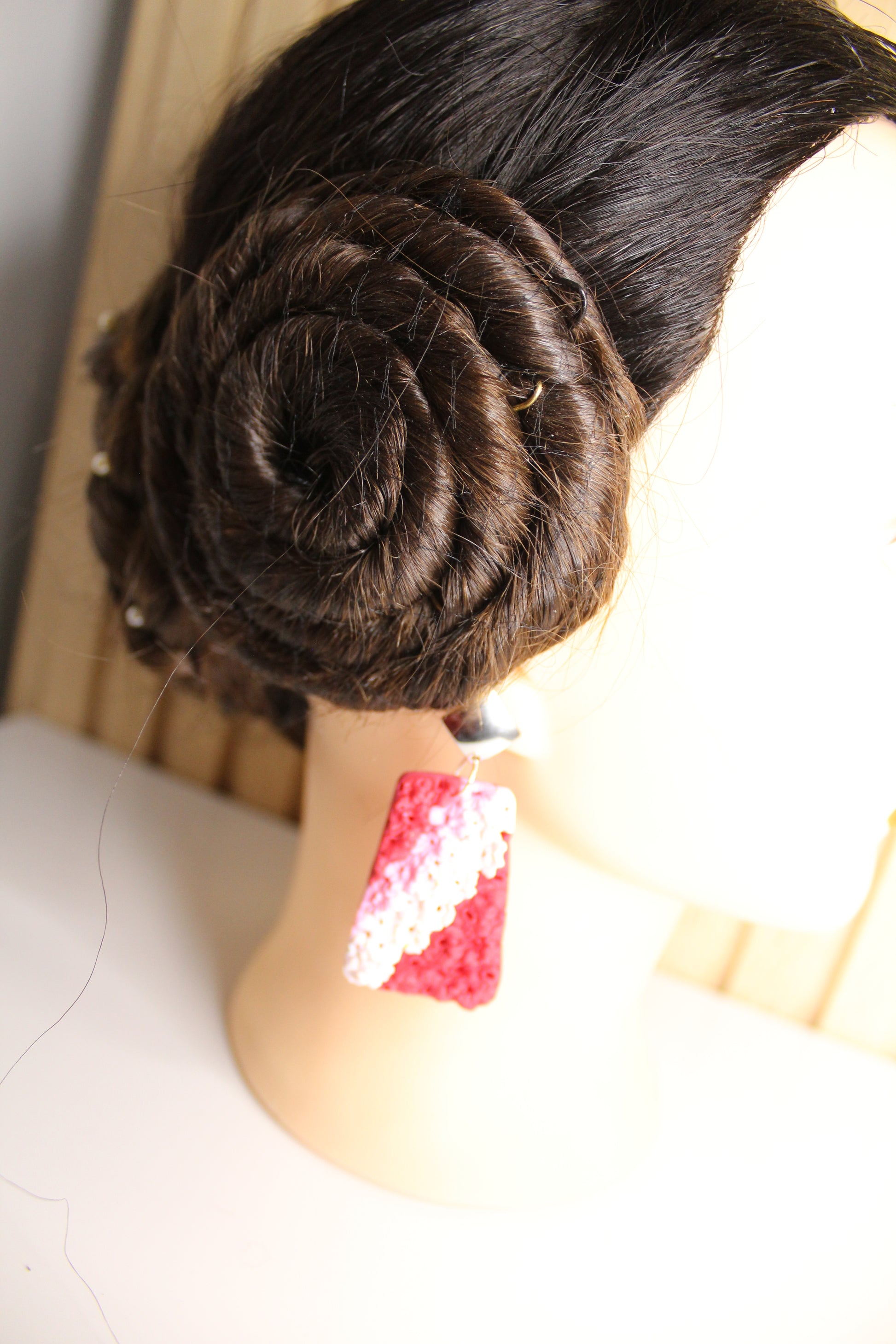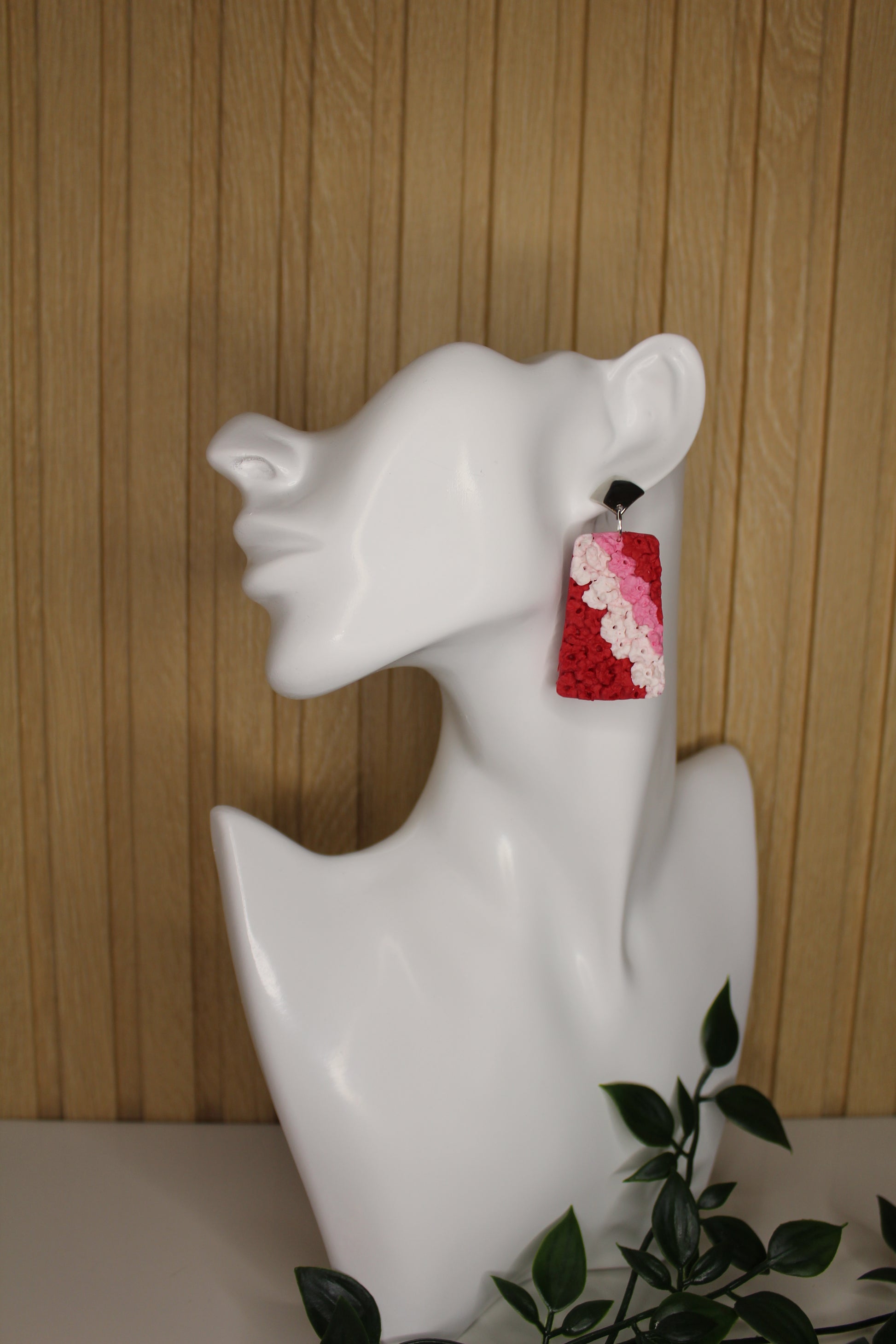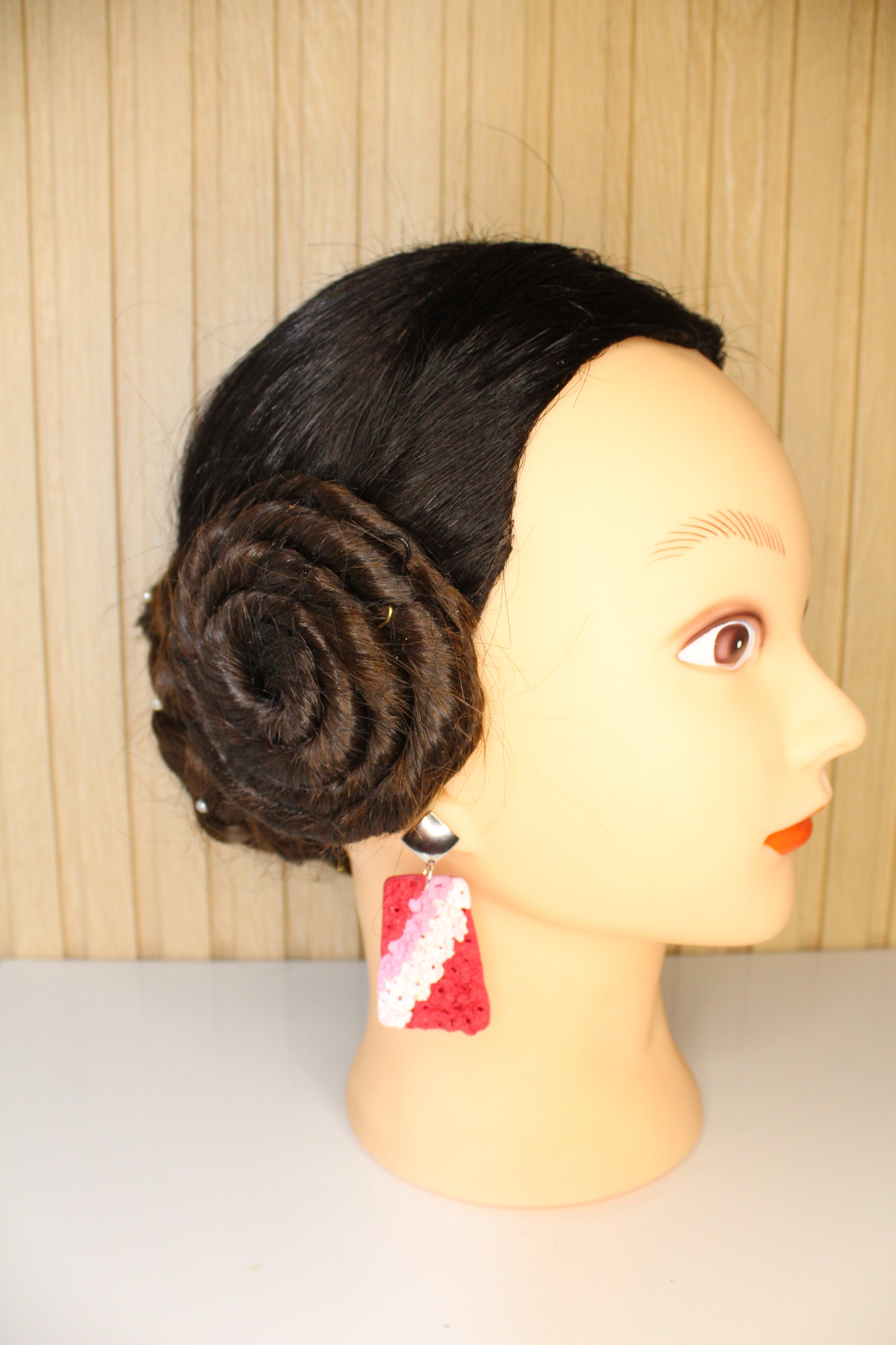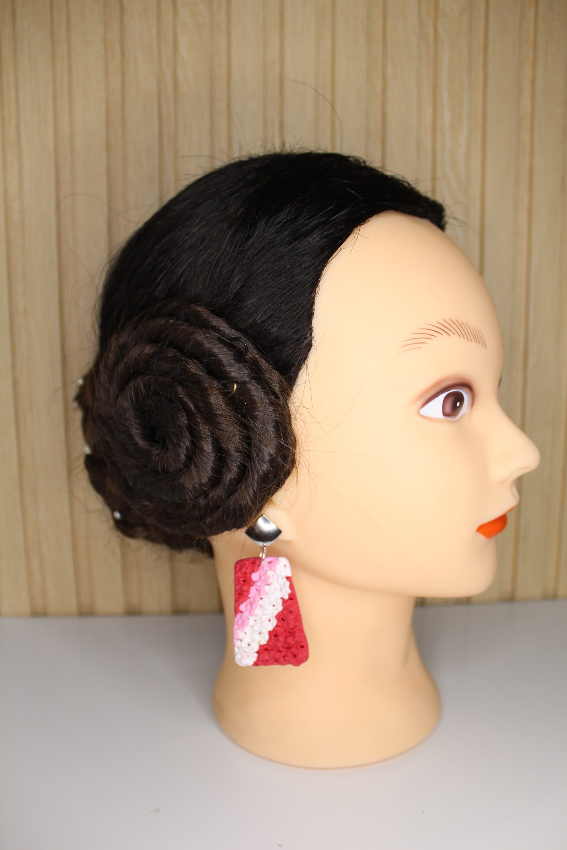 Se entregan ramos de claveles que los artistas convierten en un manto de flores para engalanar la virgen. Estos pendientes simulan ese manto con los colores típicos de la ofrenda (Rosa, rojo y blanco)