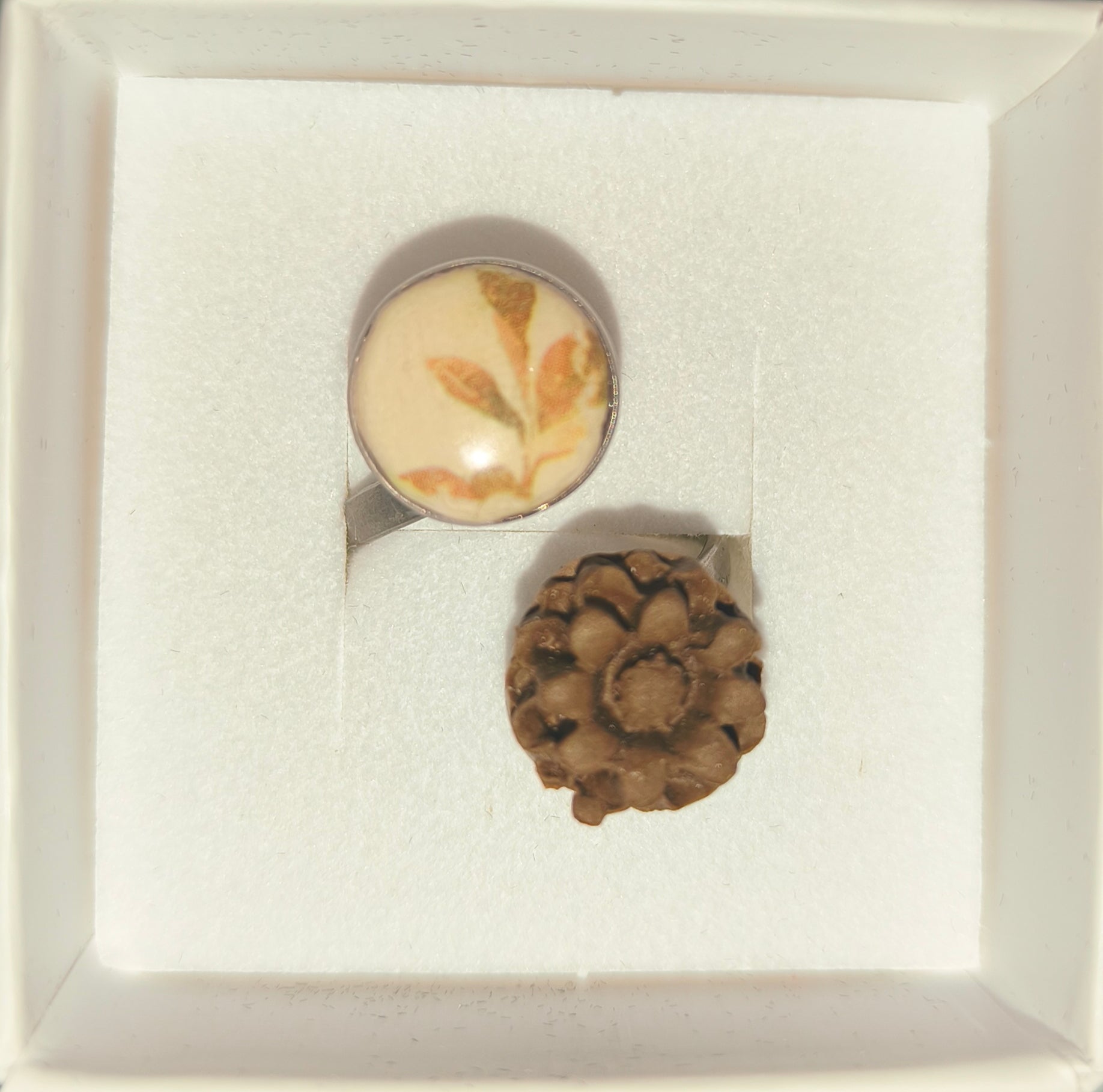 Preciosos anillos de arcilla polimérica inspirados en la colección años 50. Se componen de un circulo de papel pintado vintage y una flor a juego.