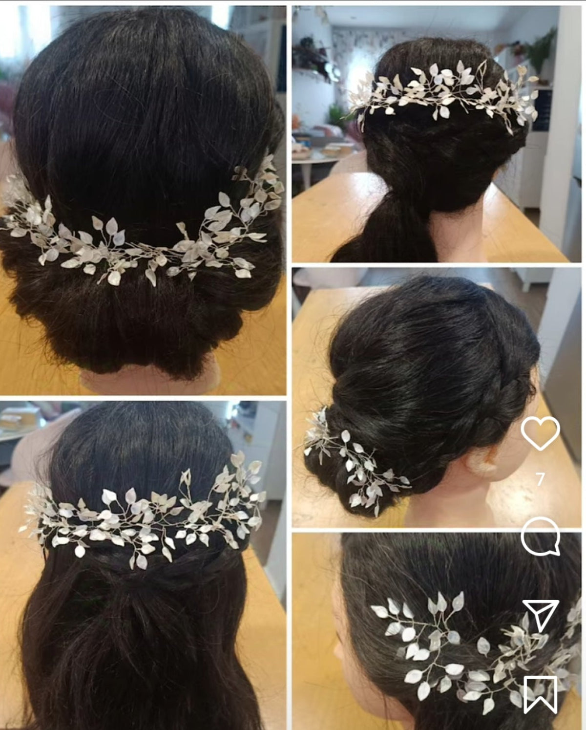 Délicat et élégant. Le Bijou Acrea est réalisée en fil d'argent et en résine nacrée d'un ton blanc nacré, formant de petites feuilles qui donneront une touche d'éclat et de couleur à votre chignon. Il intègre deux zones de fixation pour fourches ou crochets.