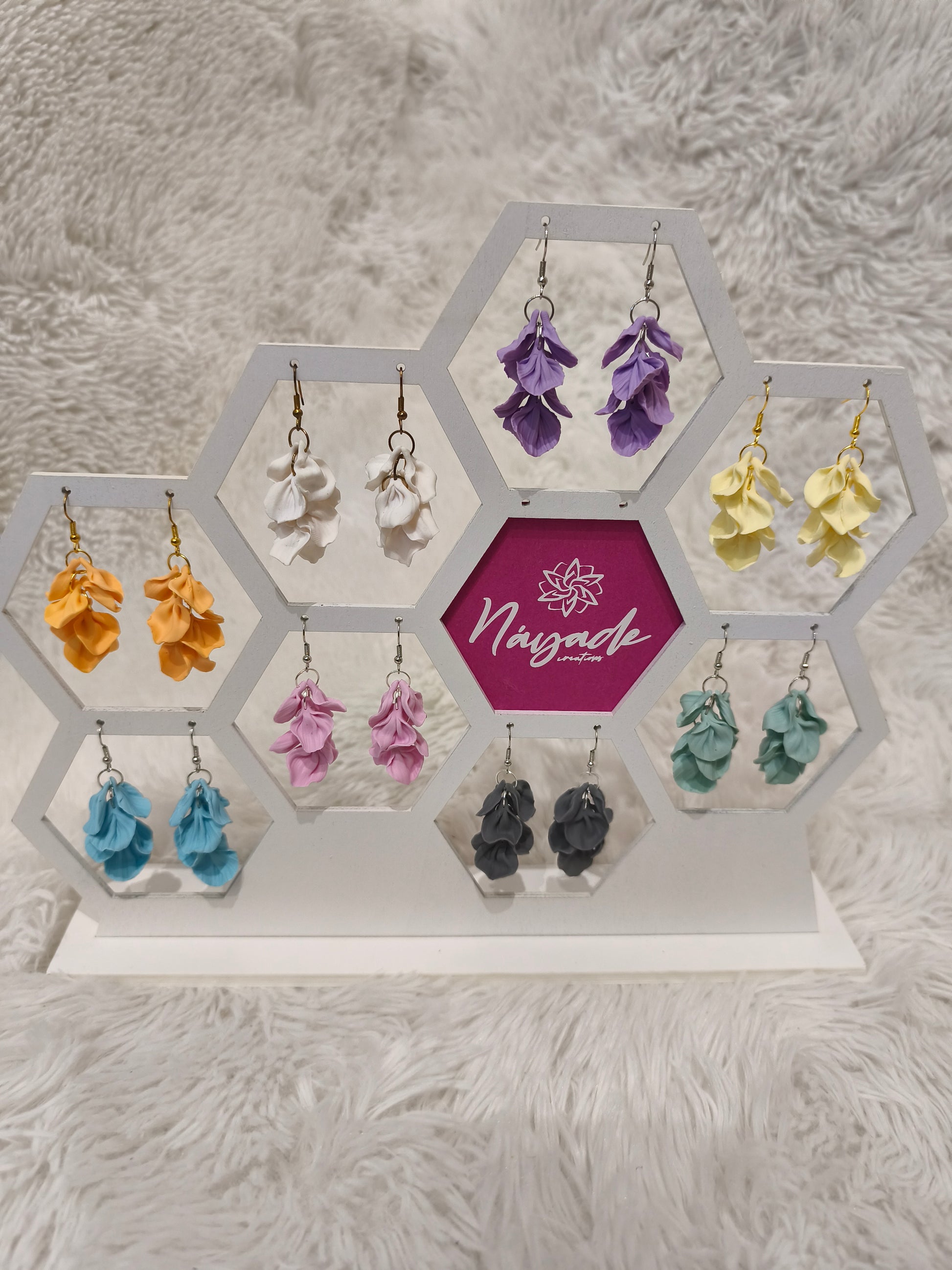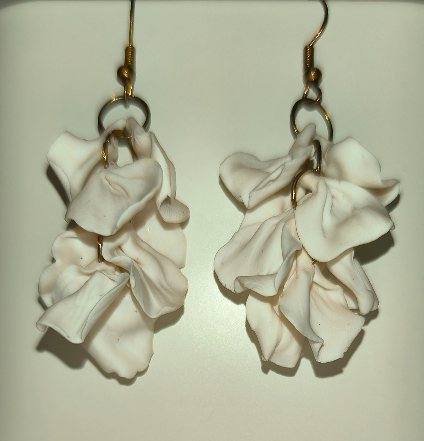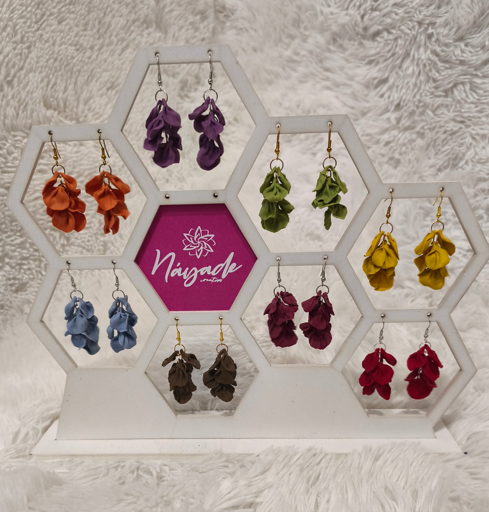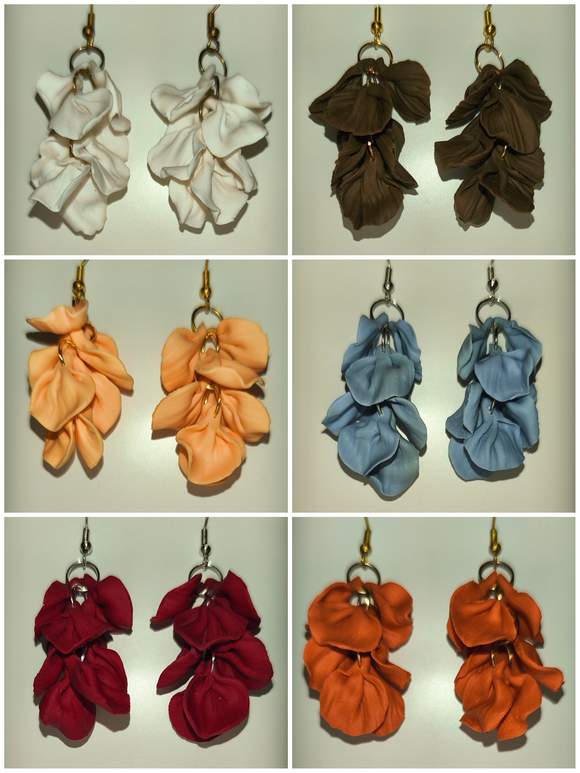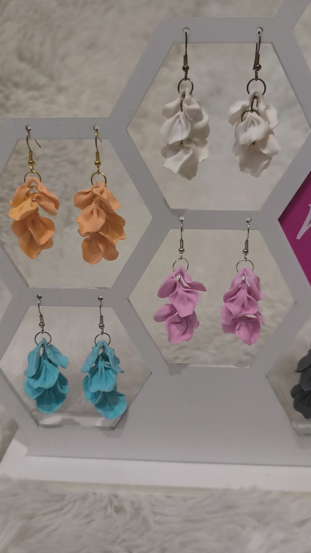 Están realizados con porcelana fina en forma de pequeños pétalos engarzados mediante uniones doradas/plateadas y coronado con un cierre en forma de U.