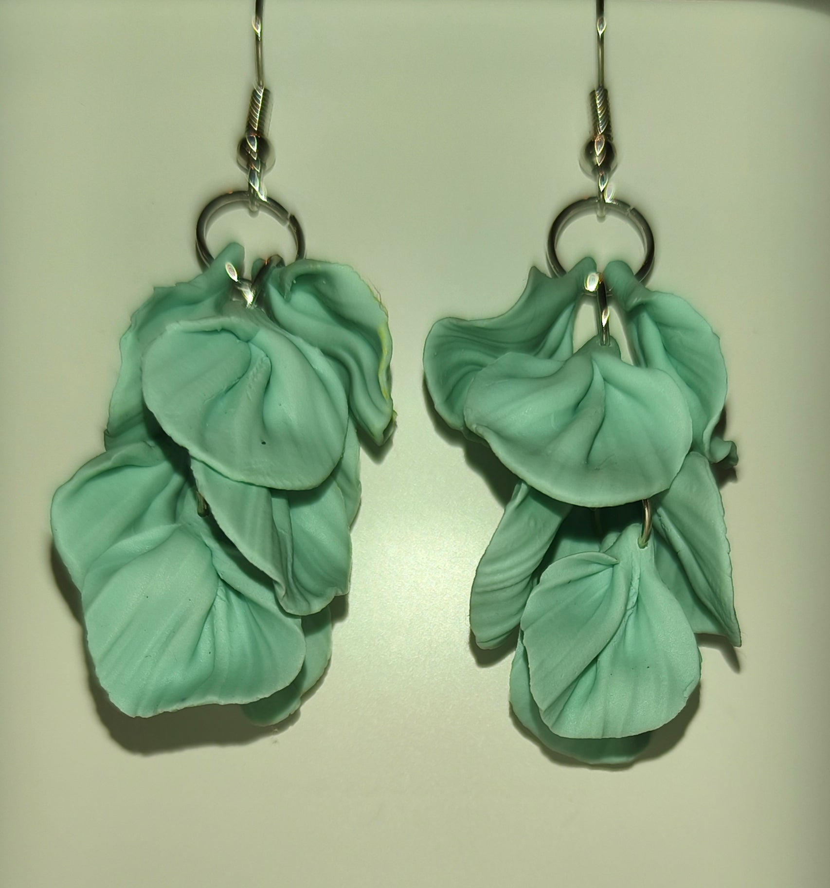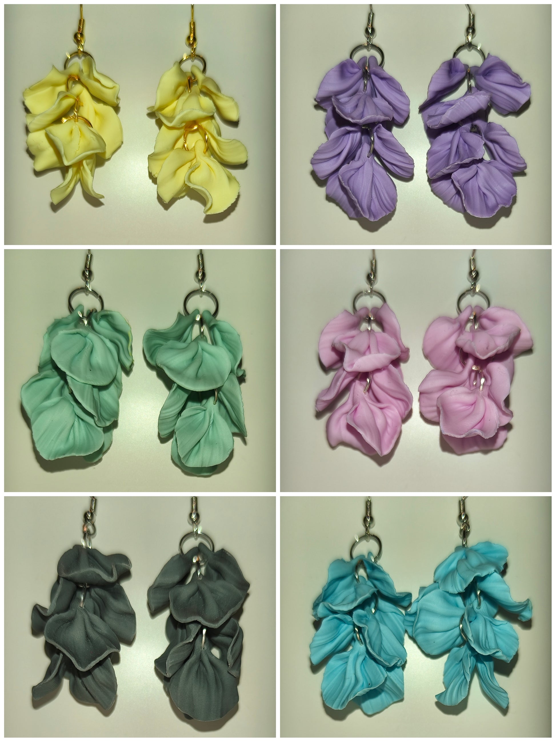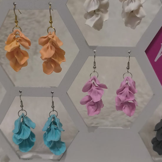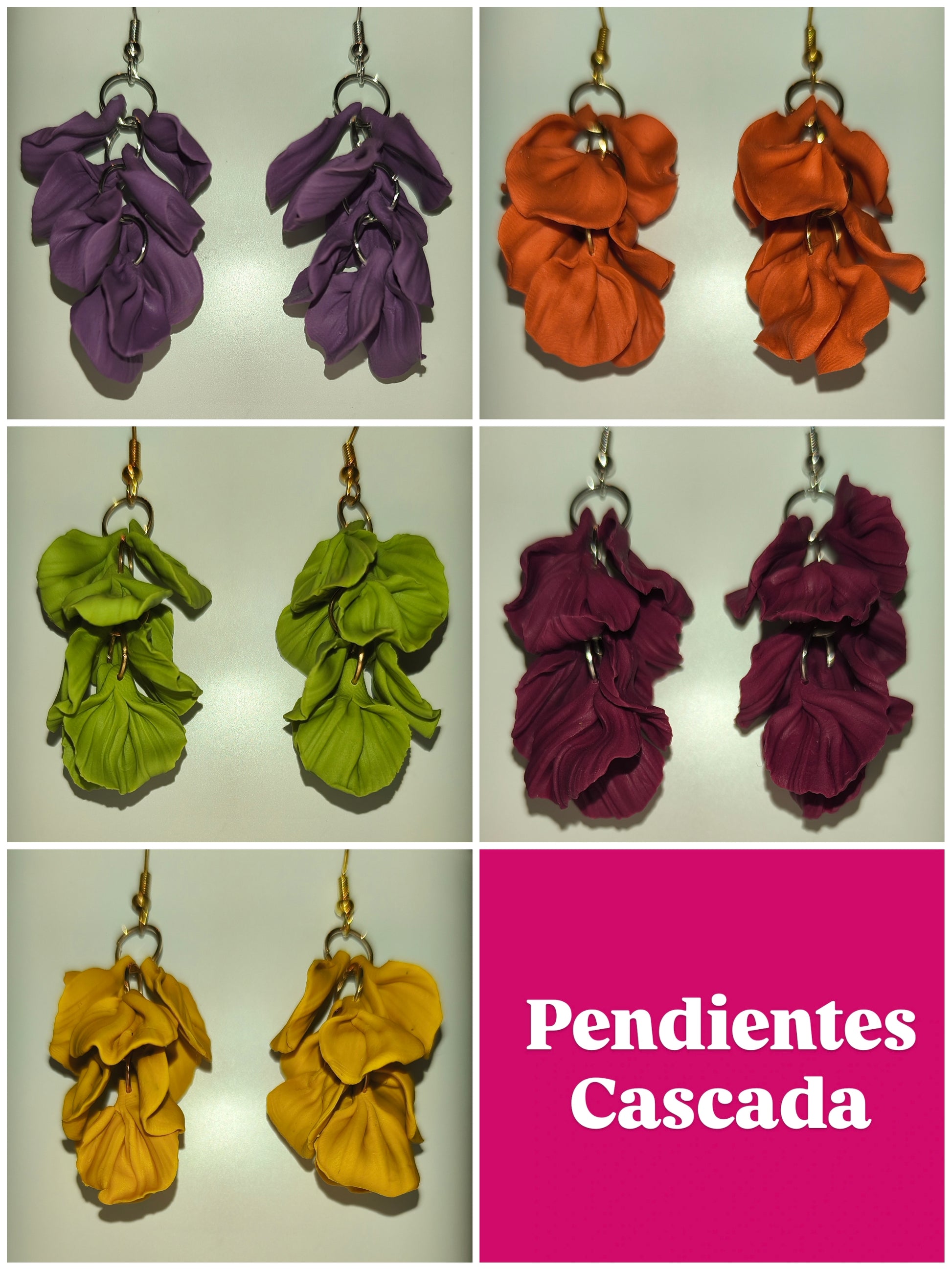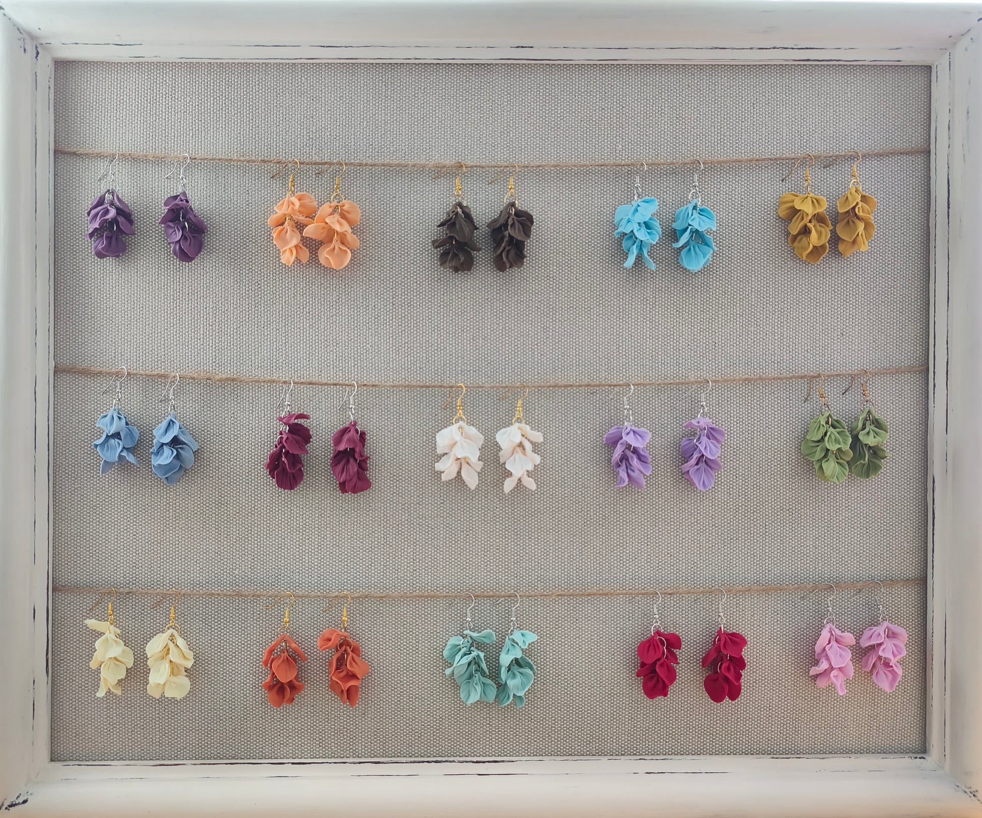 Están realizados con porcelana fina en forma de pequeños pétalos engarzados mediante uniones doradas/plateadas y coronado con un cierre en forma de U.