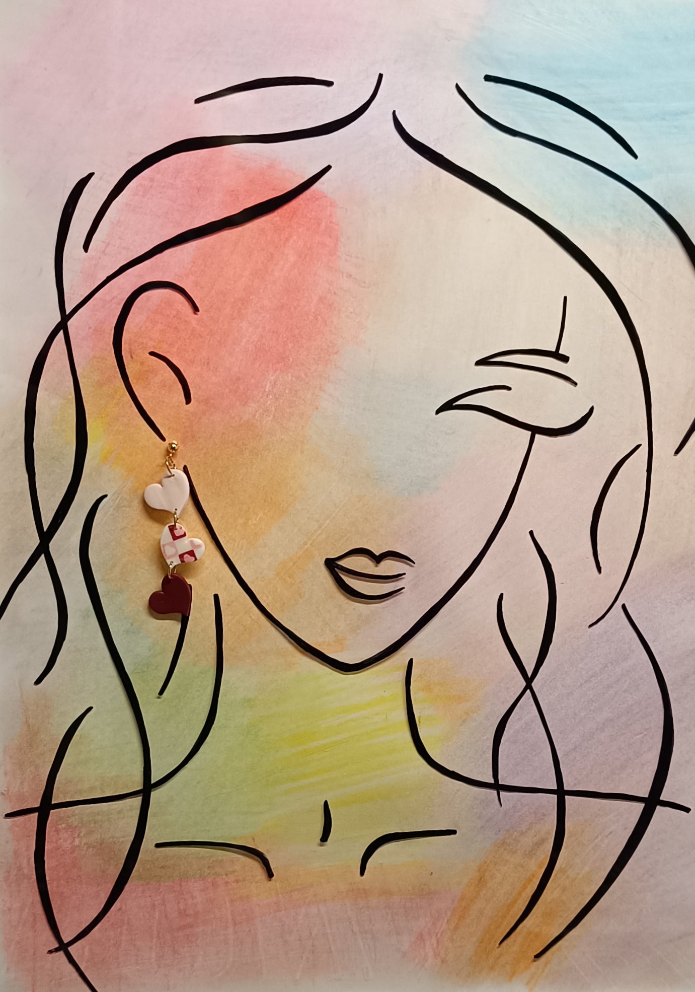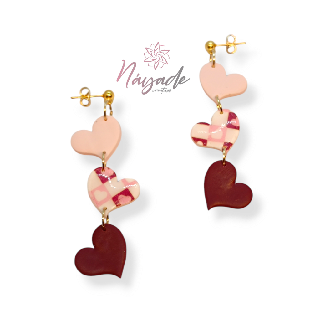 Tres corazones de porcelana, el primero en color rosa claro, el del medio estampado aludiendo a los retales que se van añadiendo y el tercero en granate, que simboliza su fuerza.